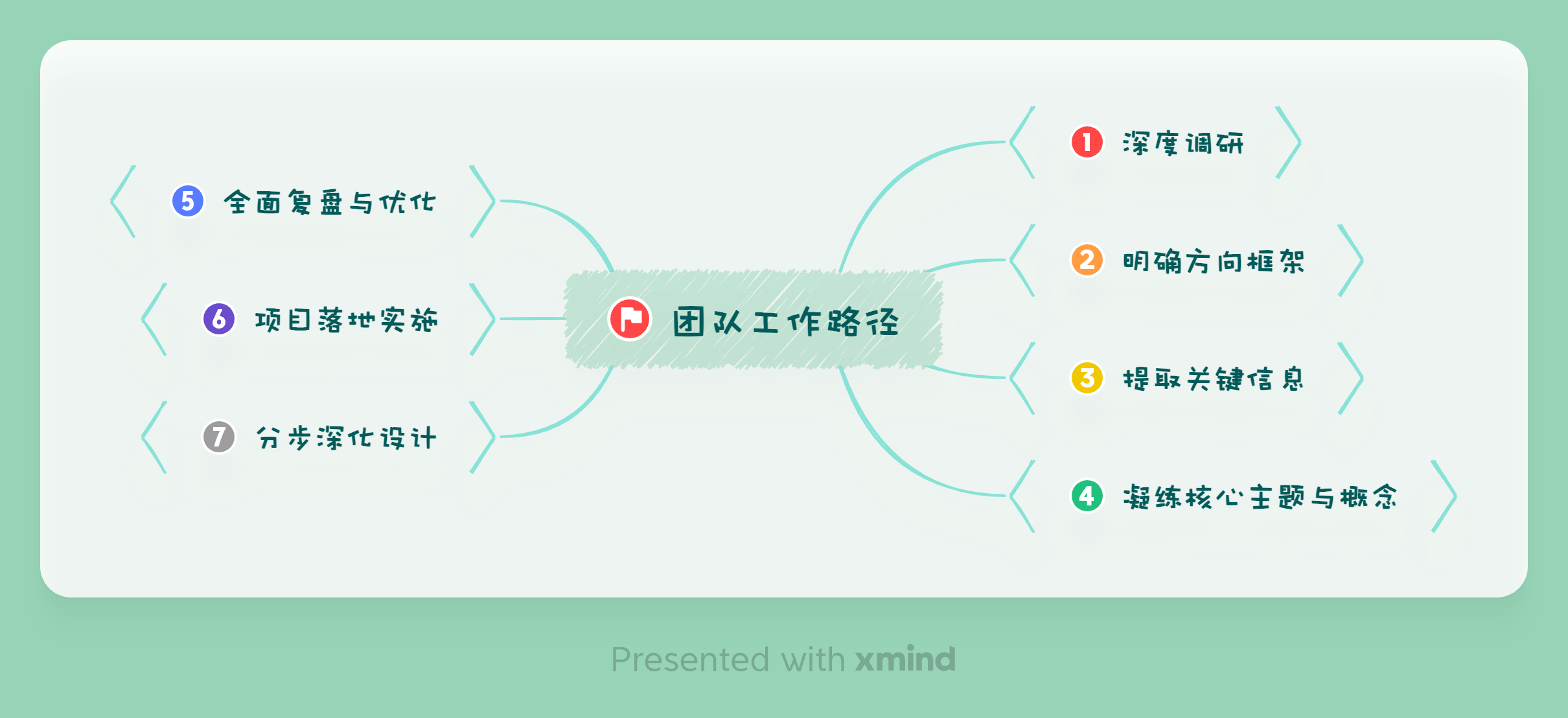 在每一个项目启动时,团队都会遵循一套高度结构化、可循环的工作路径:深度调研 → 明确方向框架 → 提取关键信息 → 凝练核心主题与概念 → 分步深化设计 → 项目落地实施 → 全面复盘与优化