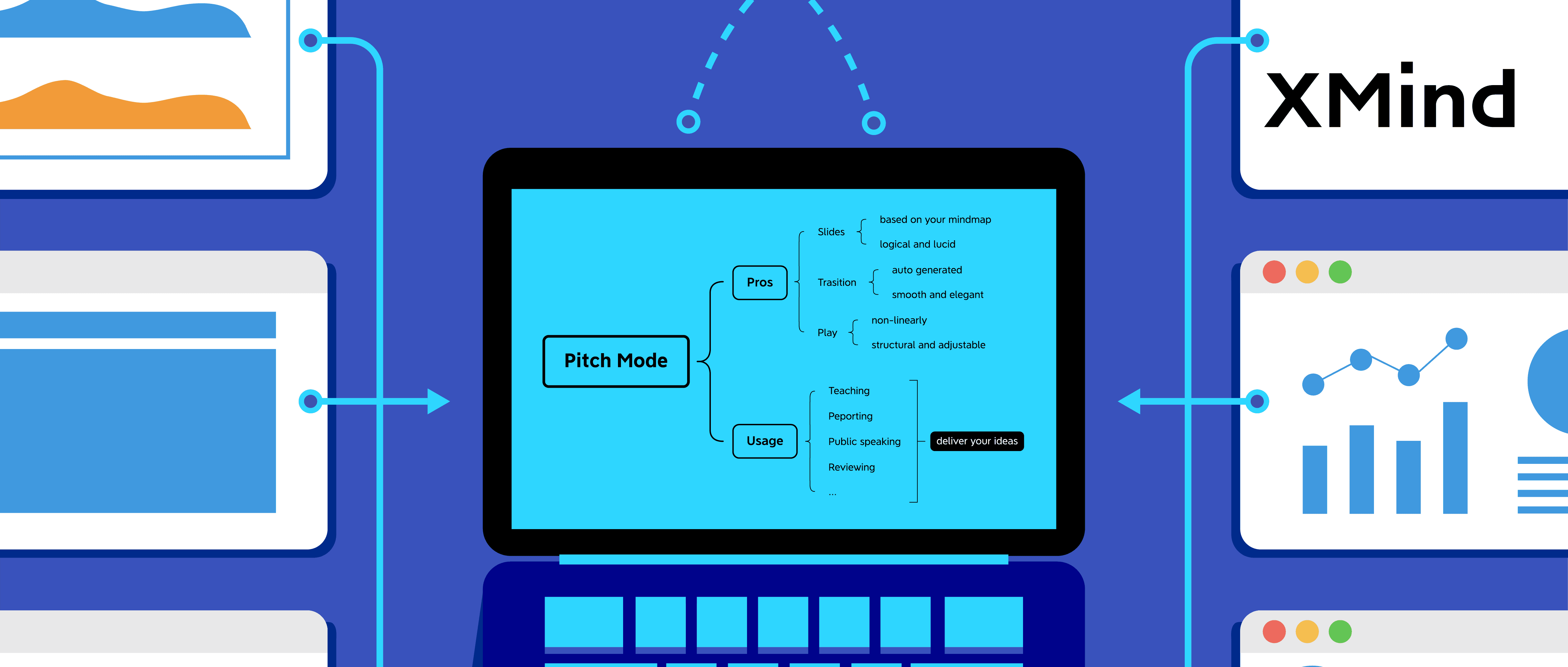 不管是否过度设计,我们都在幻灯片的样式和排版上花费了大量的时间,这和我们想要的高效和生产力背道而驰。而 XMind 的演示功能很好地解决了这个痛点。点击进入演示模式,XMind 将自动生成优雅的版式布局和转场动画。动态呈现你的逻辑脉络,结构化地展示你的内容。