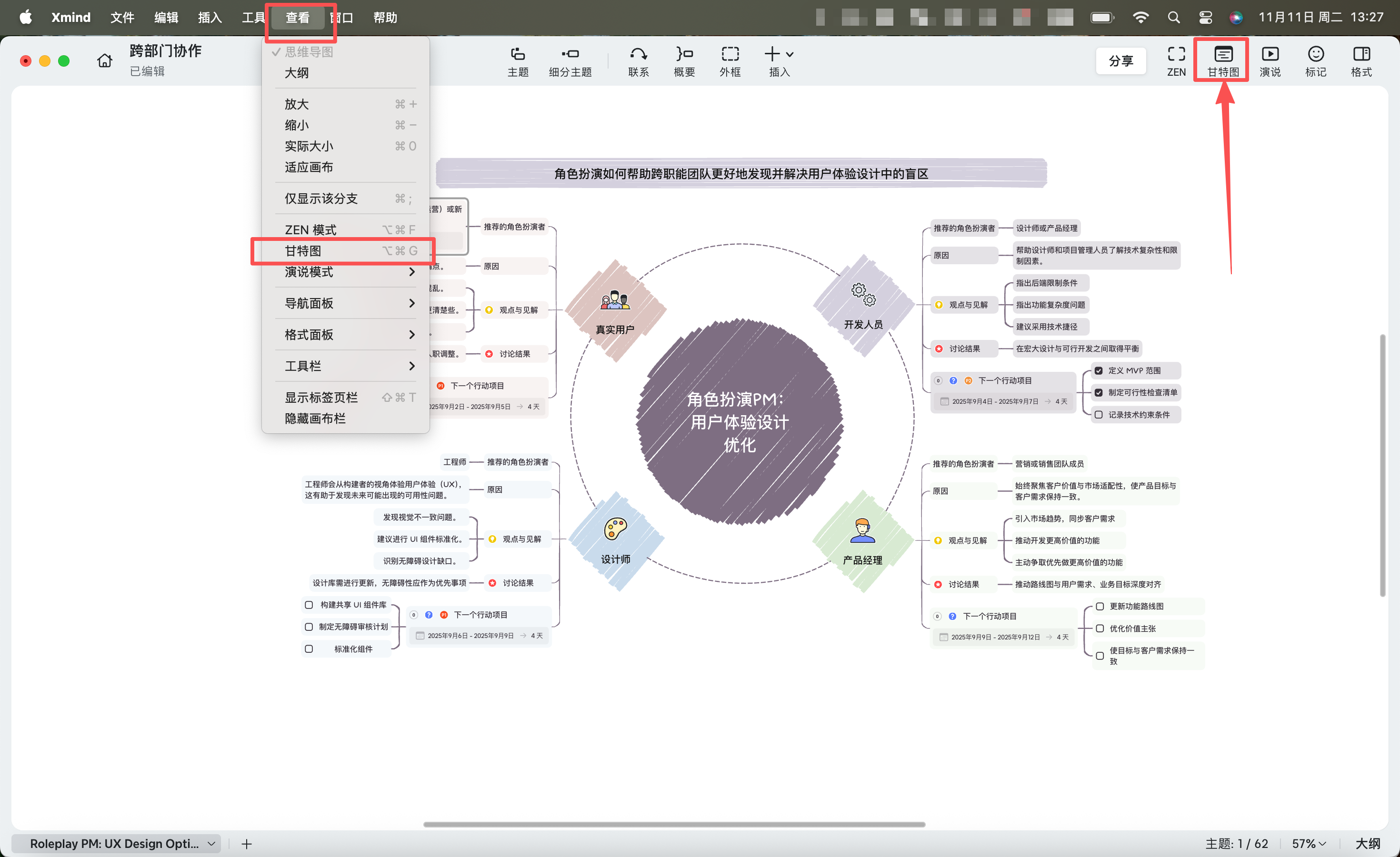 点击工具栏右上角的「甘特图」,或通过菜单栏选择「查看 → 甘特图」,即可切换成甘特图;