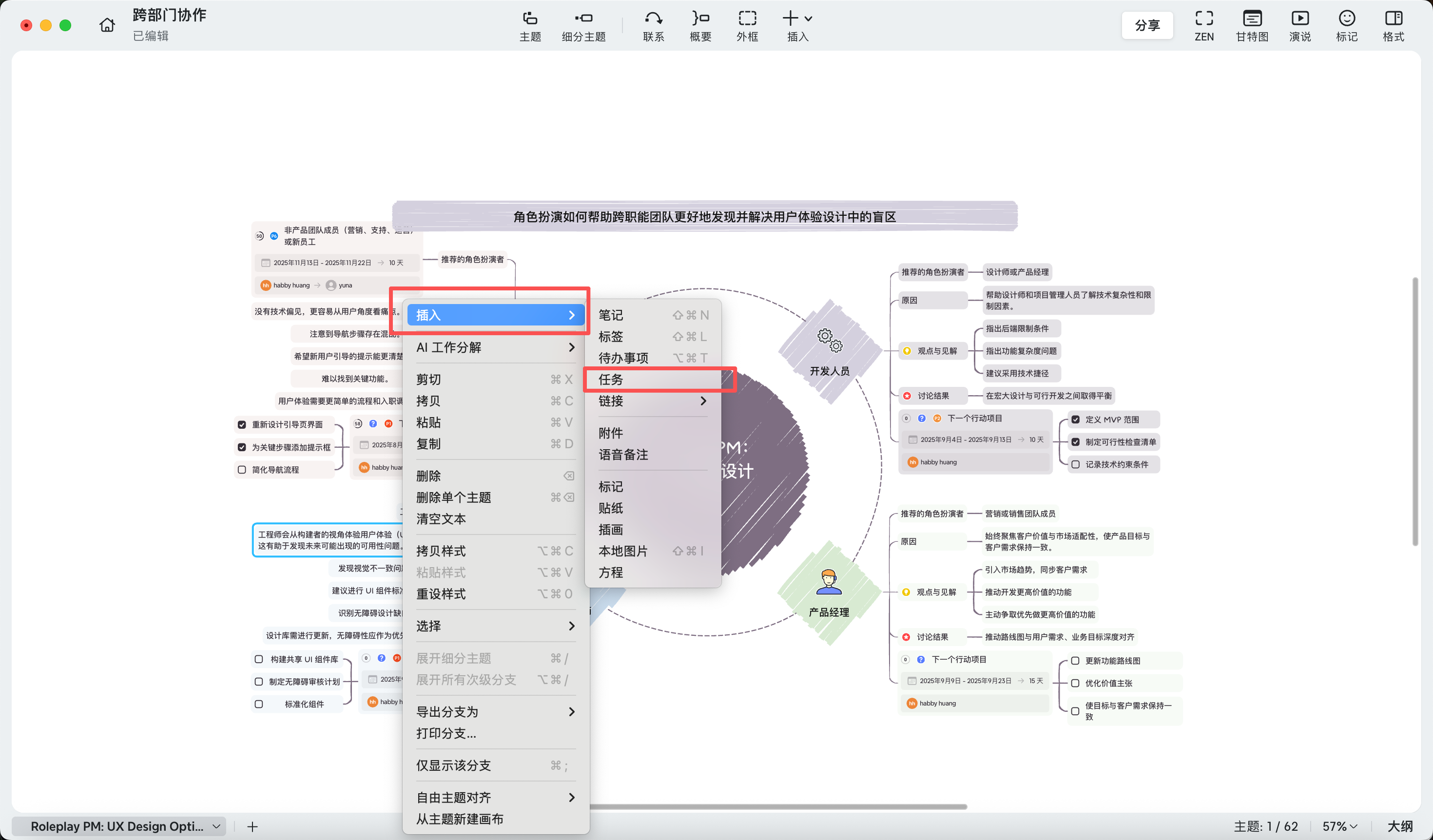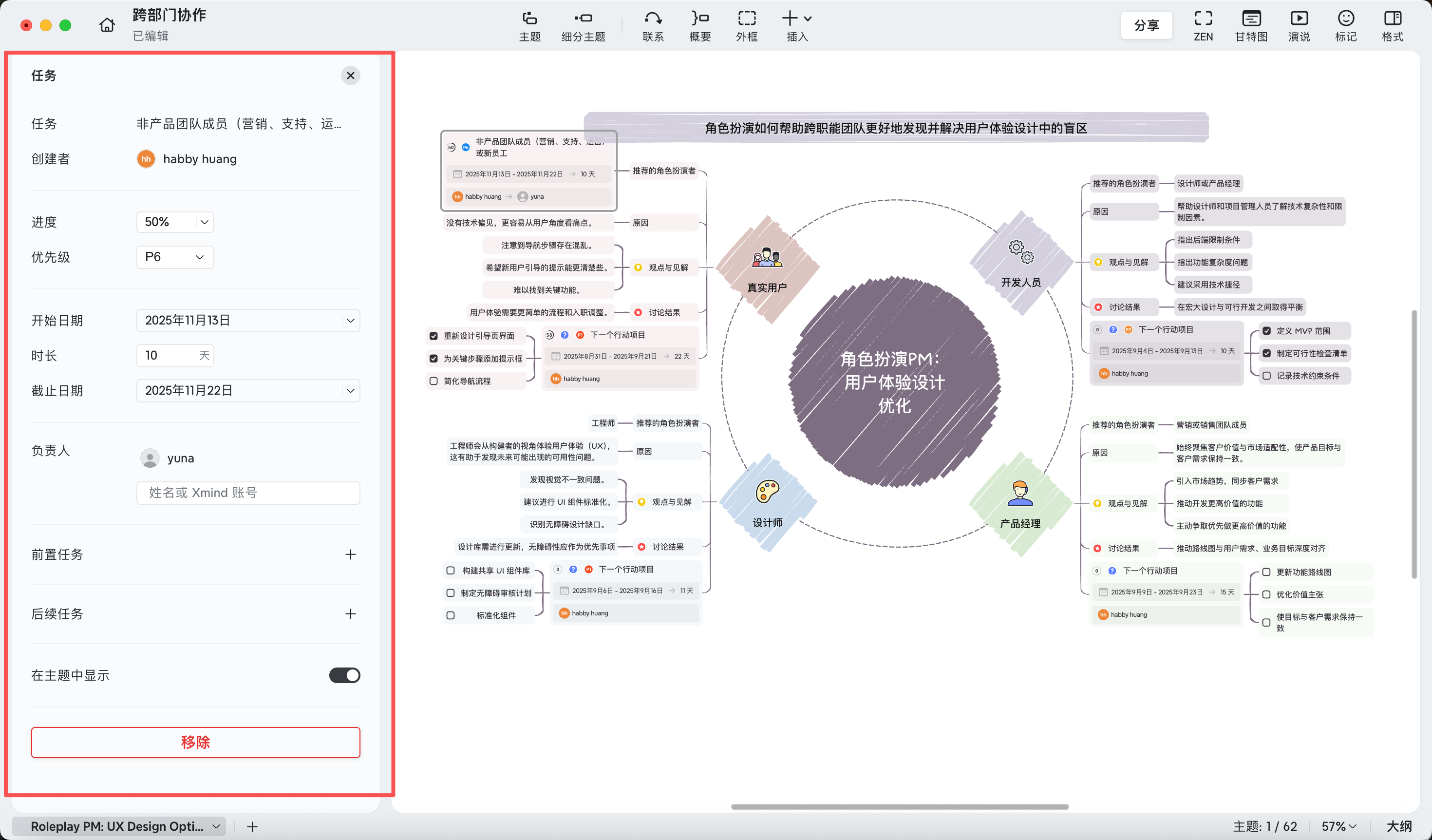 通过全新的 任务功能,你可以在导图中直接创建任务,设置优先级、截止日期、负责人与进度,一图即可完成从构思到执行的全流程管理。