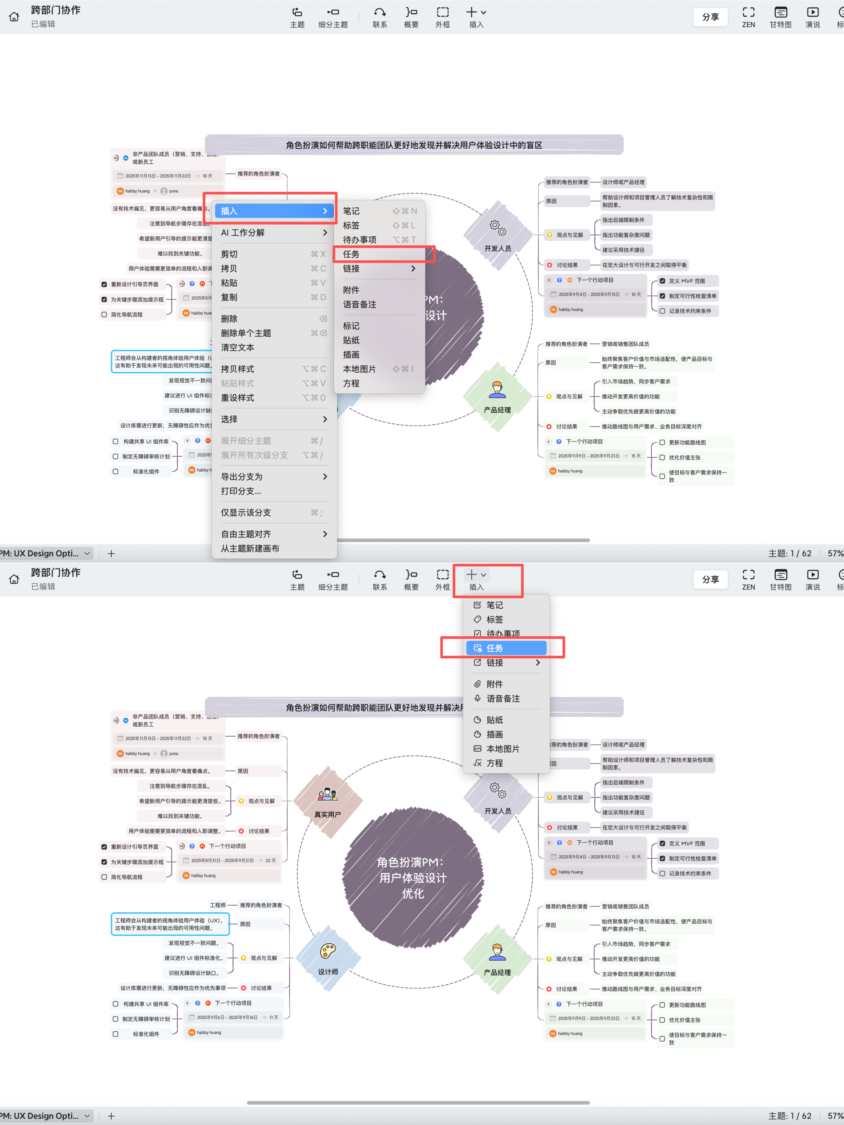 - 选中任意导图主题,从顶部工具栏中选择「+」插入「任务」,或右键插入「任务」;