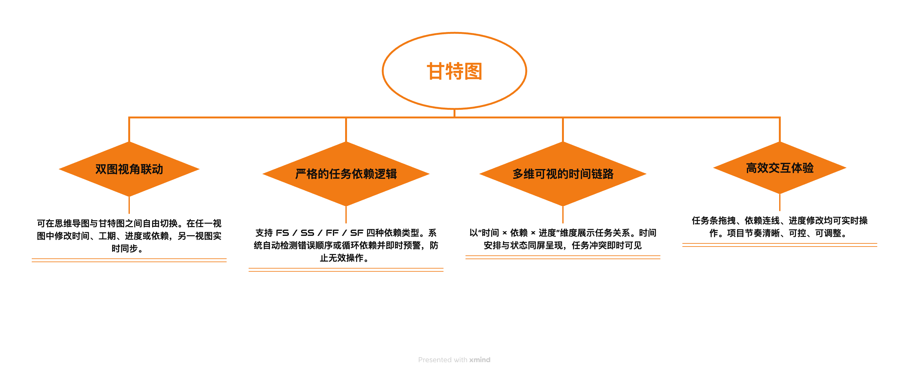 双图视角联动:思维导图 × 甘特图: 可在思维导图与甘特图之间自由切换。在任一视图中修改时间、工期、进度或依赖,另一视图实时同步。