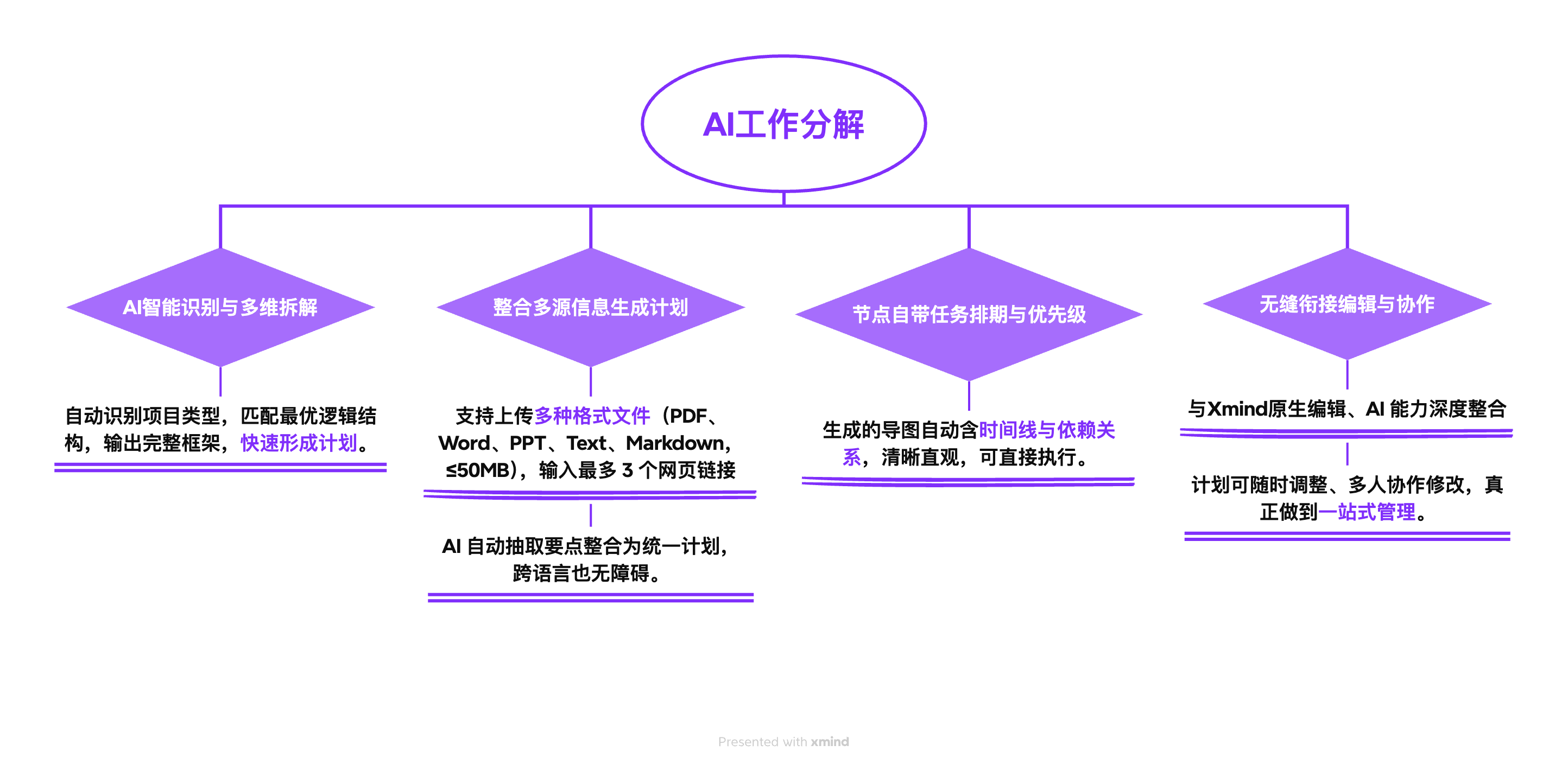 项目想法太多、信息太杂、沟通太累?Xmind 帮你“化繁为简”,让项目管理更轻快!通过 AI 工作分解、任务、任务导出、甘特图 四大功能,Xmind 让你的项目管理从规划到执行再到复盘,清晰高效、一气呵成。