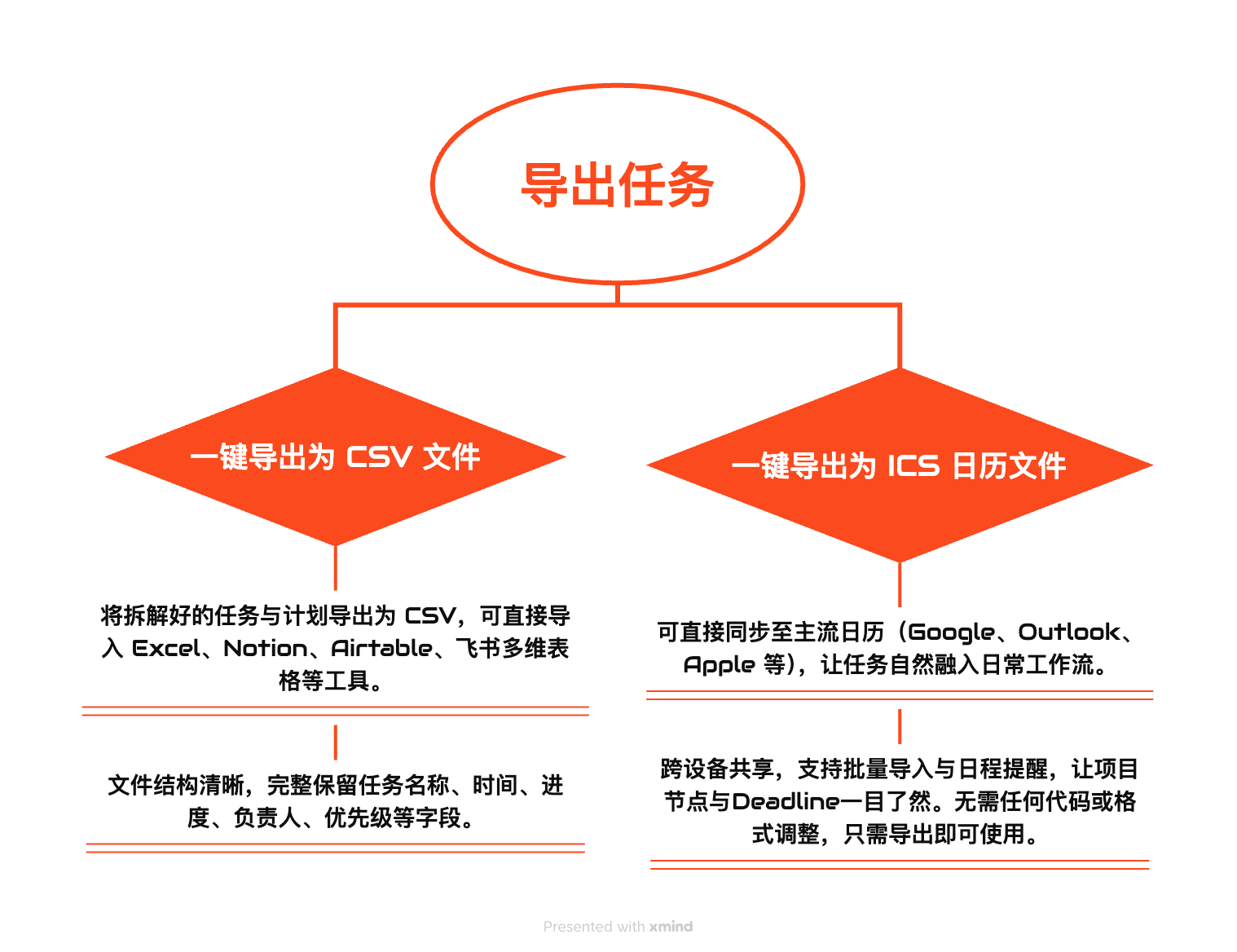 一键导出为 CSV 文件: 将拆解好的任务与计划导出为 CSV,可直接导入 Excel、Notion、Airtable、飞书多维表格等工具。文件结构清晰,完整保留任务名称、时间、进度、负责人、优先级等字段。