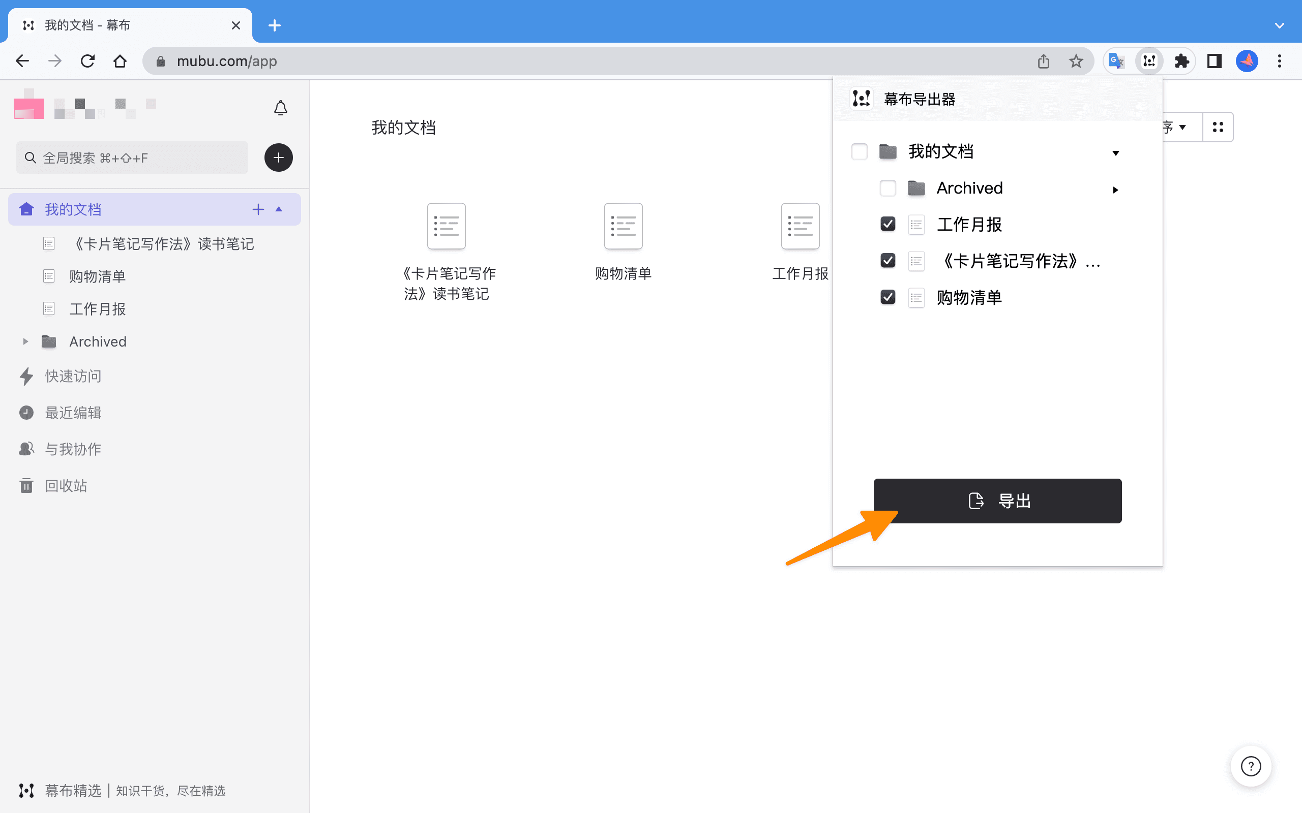 方式一:再次点击「幕布导出器」插件,在面板中勾选需要导出的幕布文件或文件夹,然后选择导出格式,完成导出。
