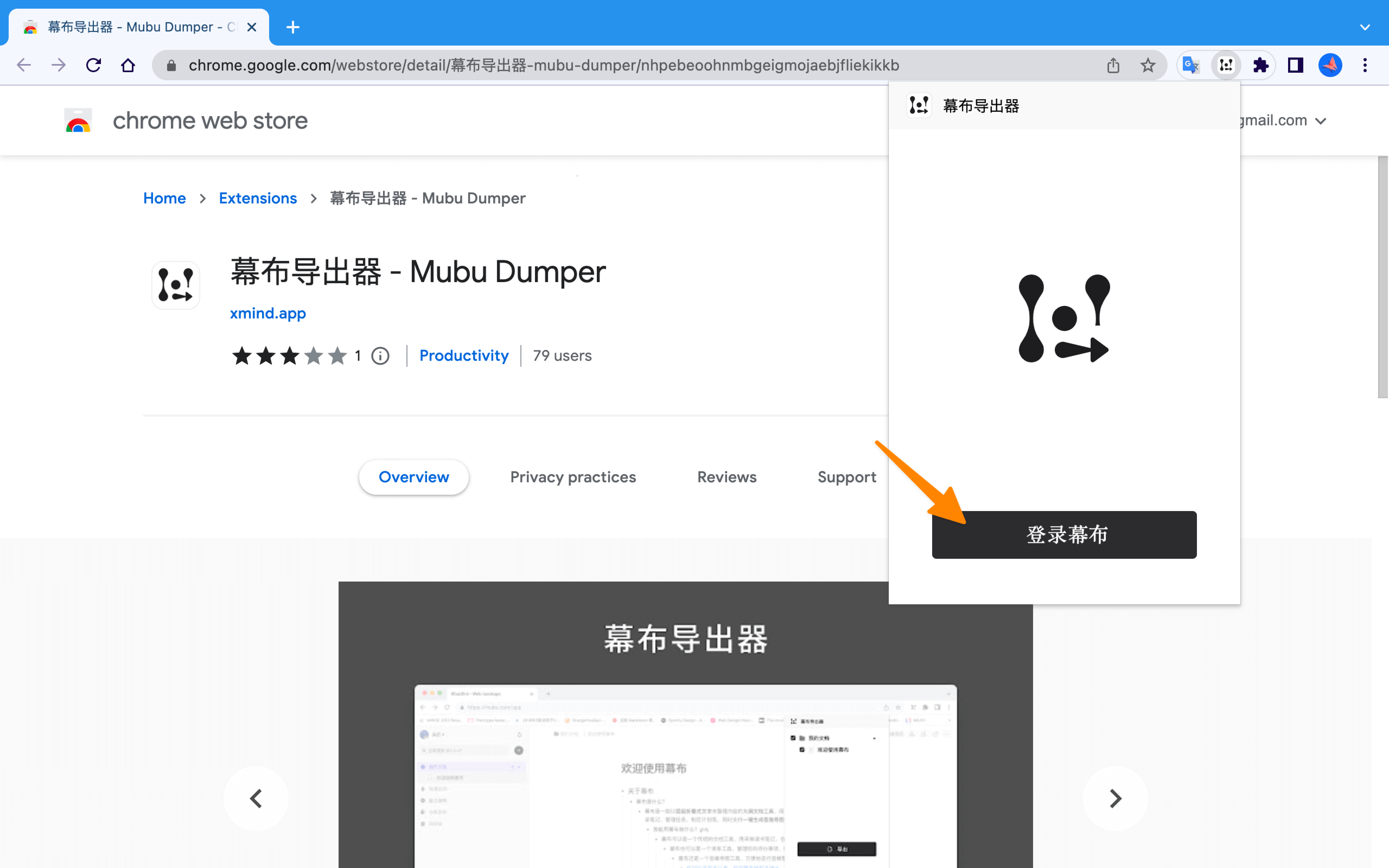 在浏览器右上角插件列表中点击「幕布导出器」。点击「登录幕布」后跳转到幕布网页版并完成登陆。