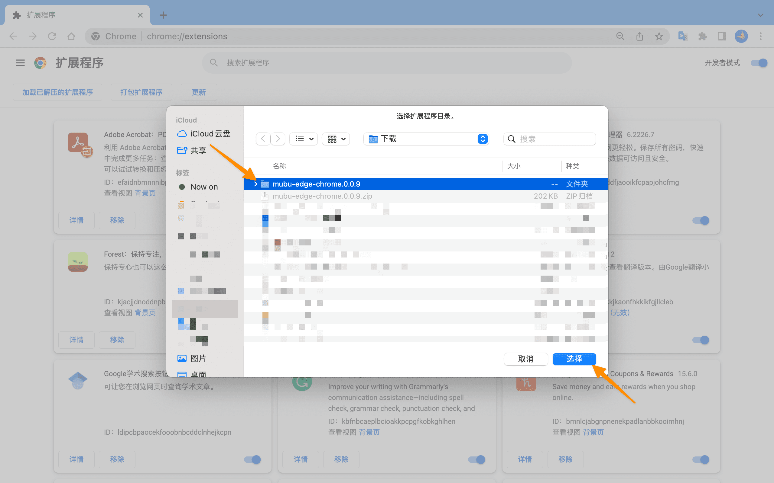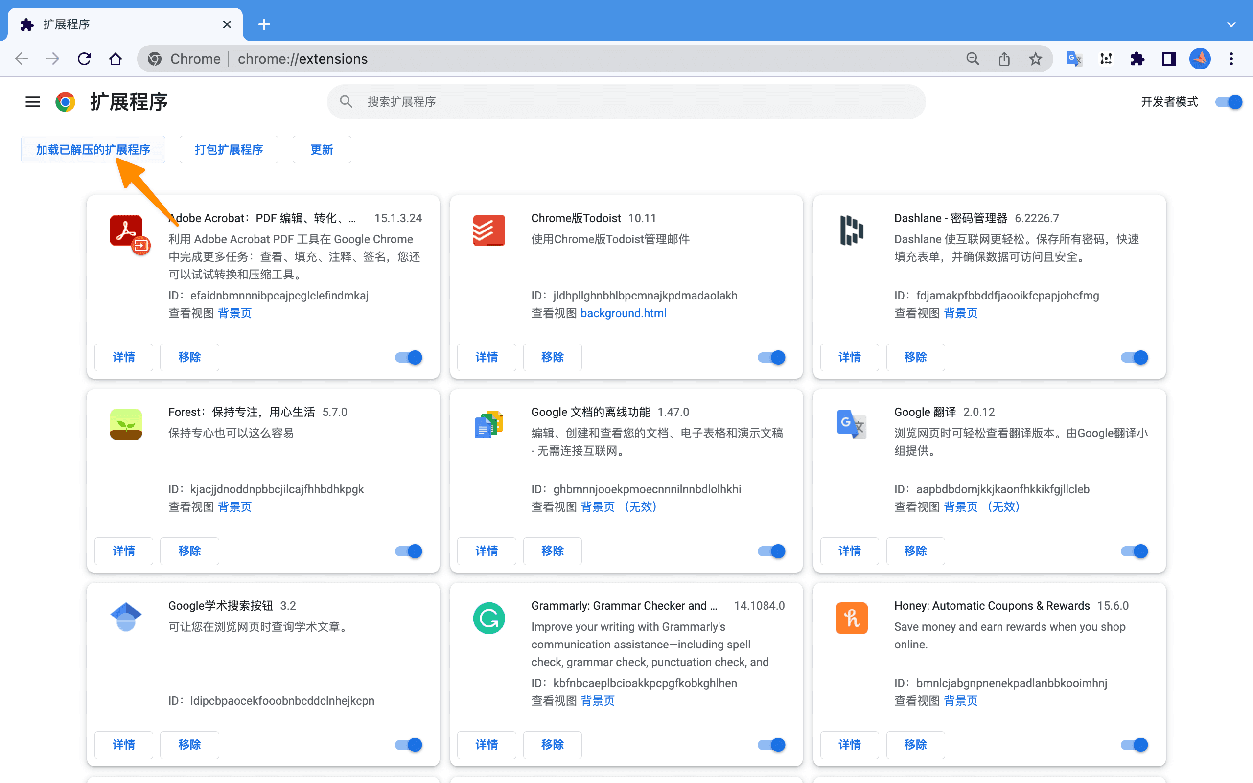 前往浏览器并开启“扩展程序”页面。Chrome:顶部菜单栏点击“窗口” -> “扩展程序“ 或 浏览器地址栏内打开 chrome://extensions/ (Edge为 edge://extensions/ )