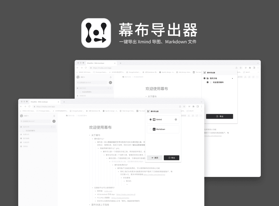 Xmind 推出的幕布导出器支持将幕布文档批量导出为 Xmind 思维导图文件和 Markdown 文件。只需要在浏览器中安装幕布导出器插件,就可以一键将全部幕布文档导出,完成幕布到 Xmind 的流畅转移。