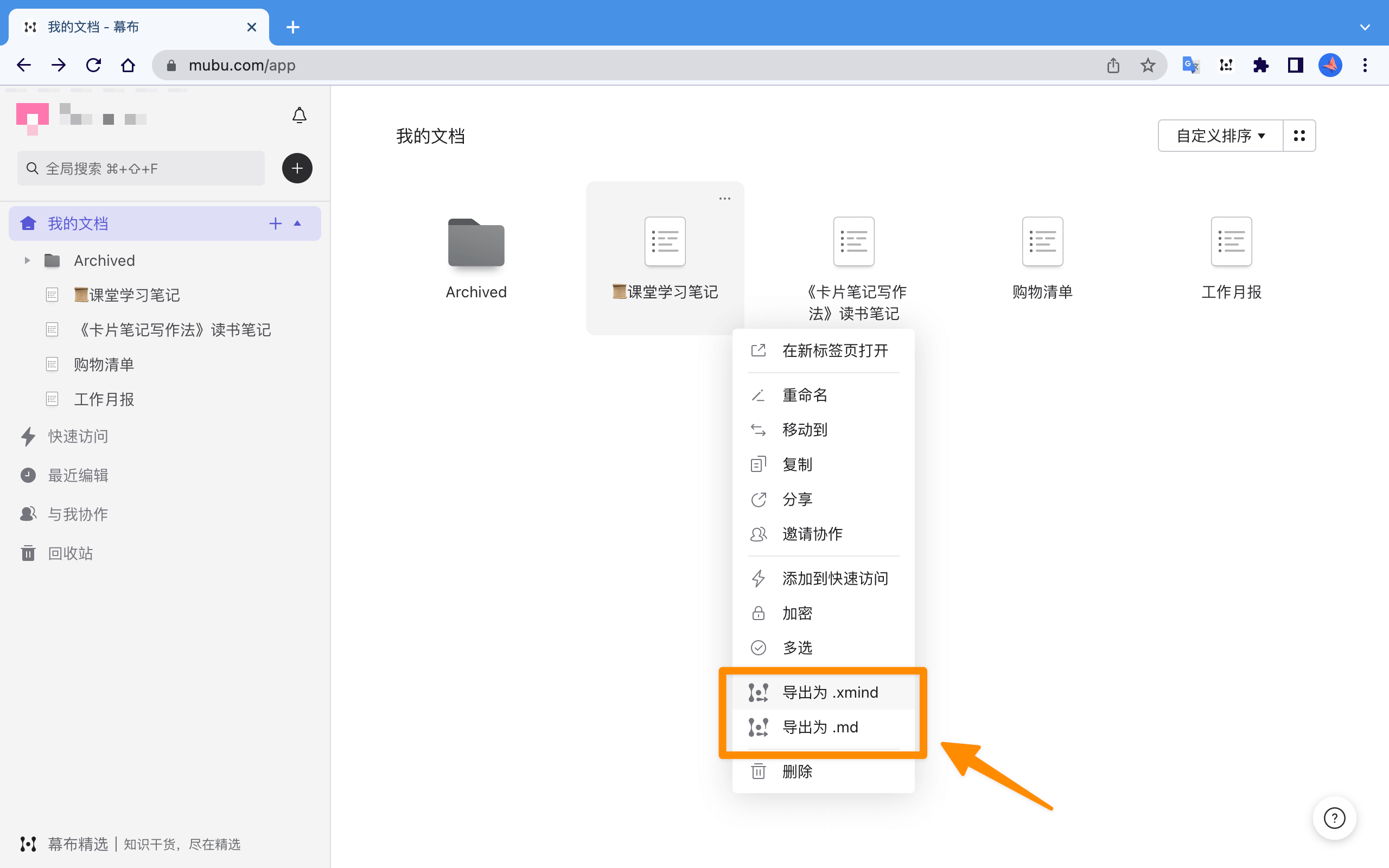 方式二:在幕布中右键点击需要导出的幕布文件或文件夹,在菜单中选择需要导出的格式,完成导出。