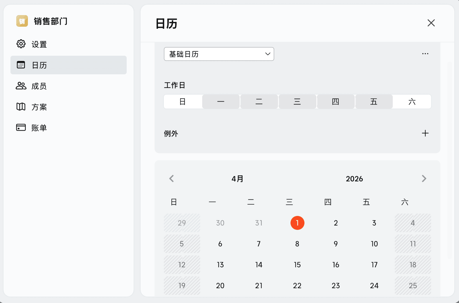 日历用于支持任务管理和甘特图功能。团队所有者和管理员可以创建团队通用的日历,统一设置工作日和休假日,以便更高效地进行项目管理。