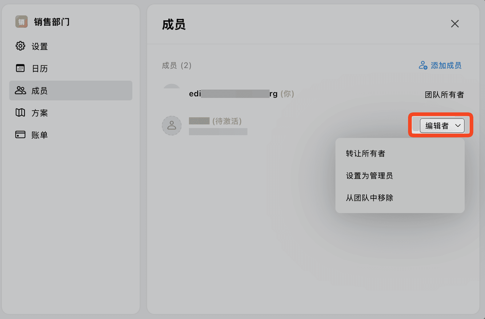 邀请新的团队成员:当成员显示“(待激活)“,表明该用户尚未接受邀请加入团队,您可以移除重新邀请,或提醒该用户接受邀请。