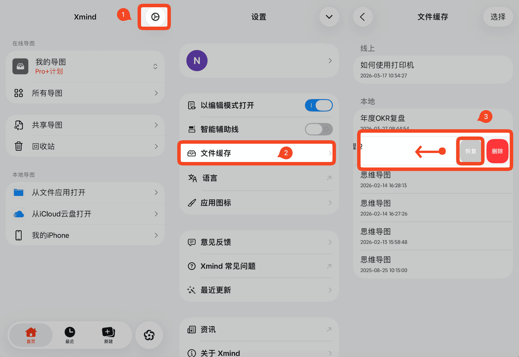 选择需要恢复的导图备份版本,点击 恢复。