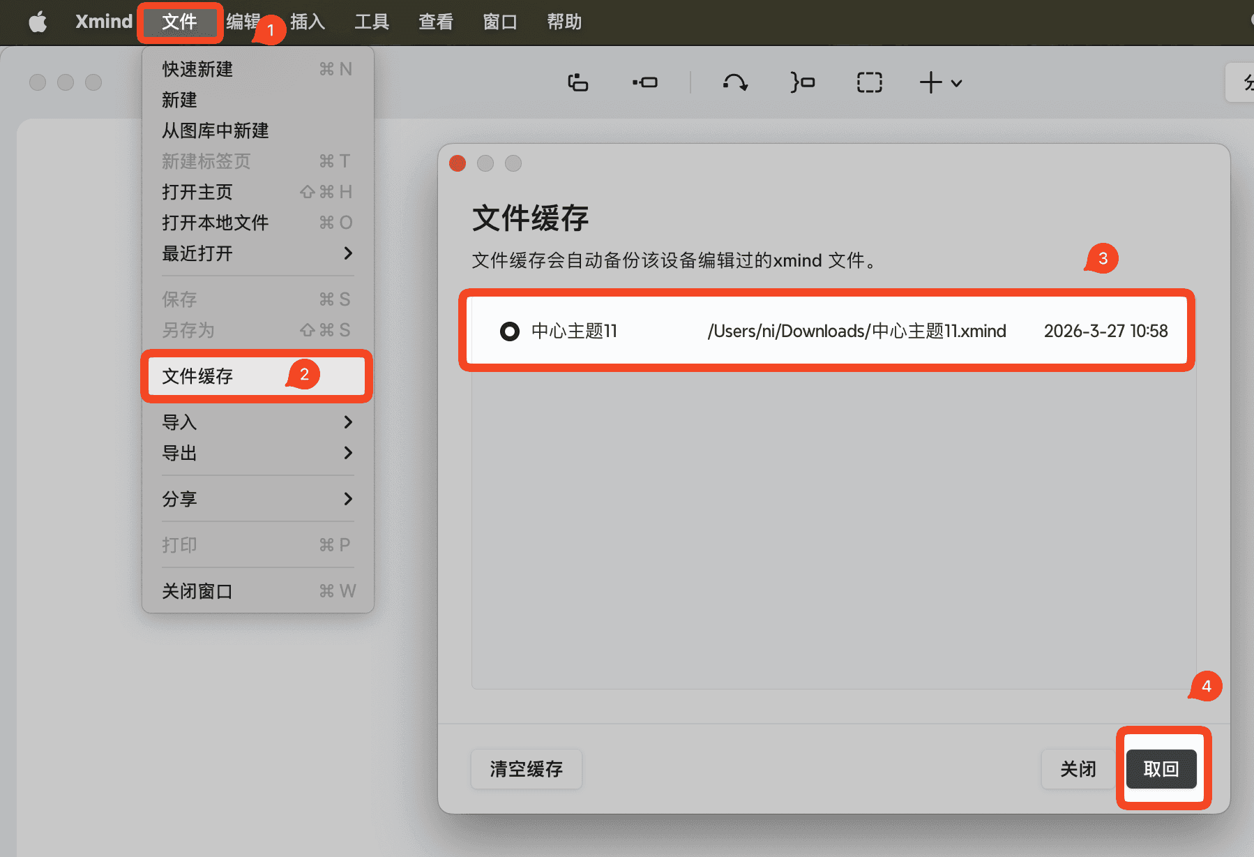 如果您的思维导图是使用 Xmind 桌面版 创建并保存在本地的,您可以尝试通过 文件缓存 功能进行恢复。