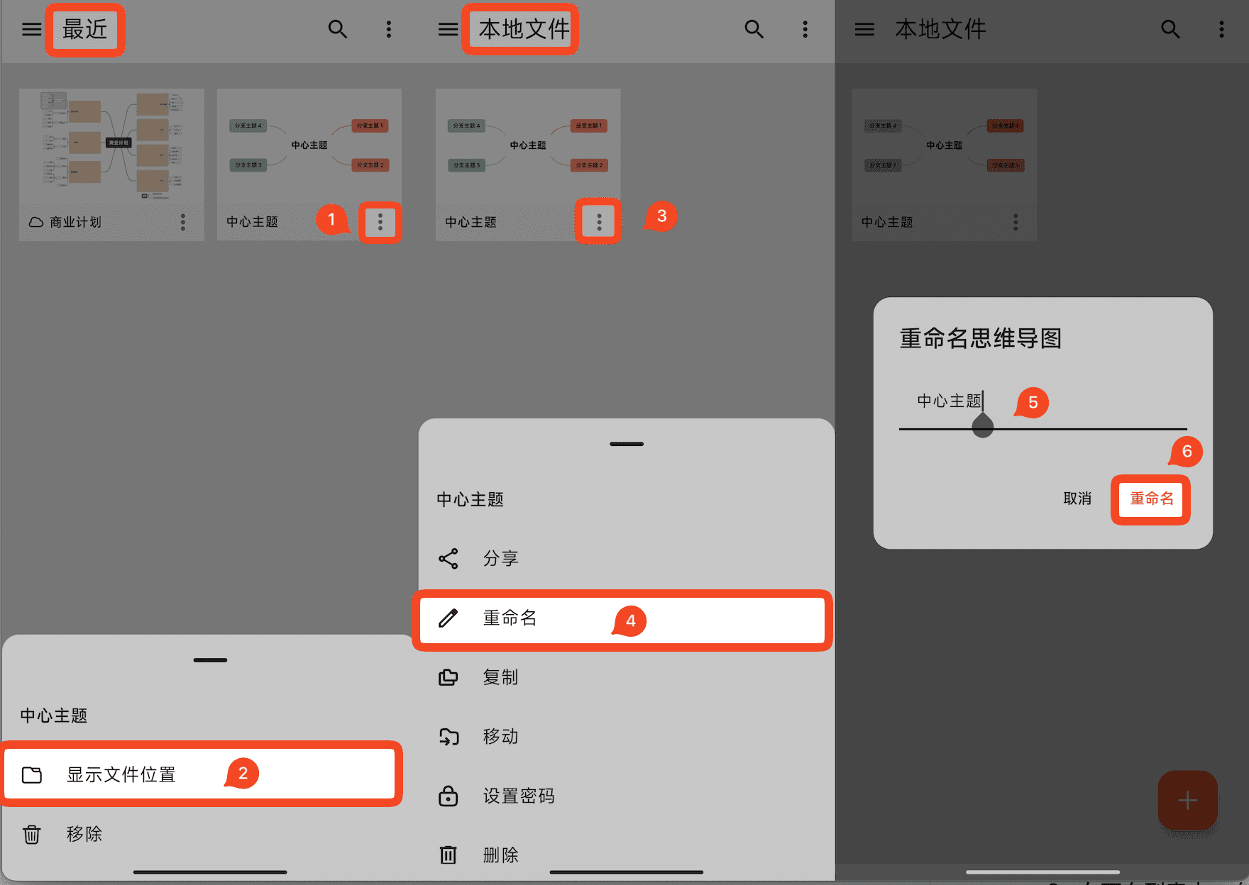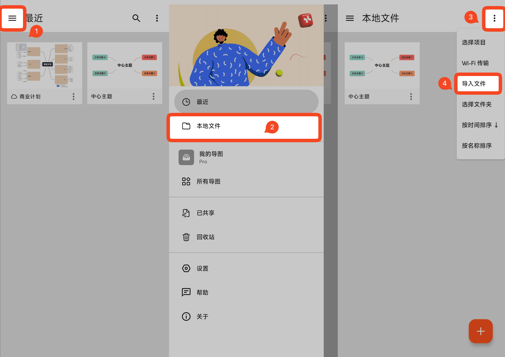 应用内导入:在应用内点击左上角 「≡」→ 本地文件,点击右上角 「⋮」→ 导入,即可导入 .xmind 或 .md 格式文件。