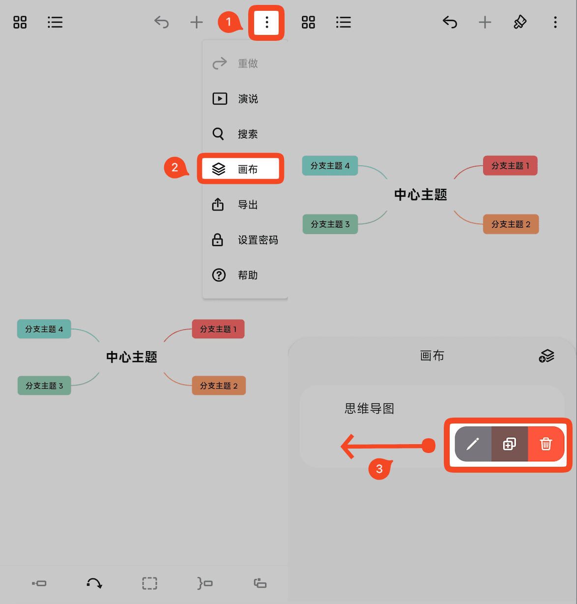 打开任意思维导图,点击右上角 「⋮」→ 画布 进入管理面板。